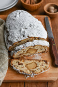 Stollen is a sweet buttery yeasted German bread bursting with dried fruit cherries spices and more season delights for a delicious treat at Christmas.